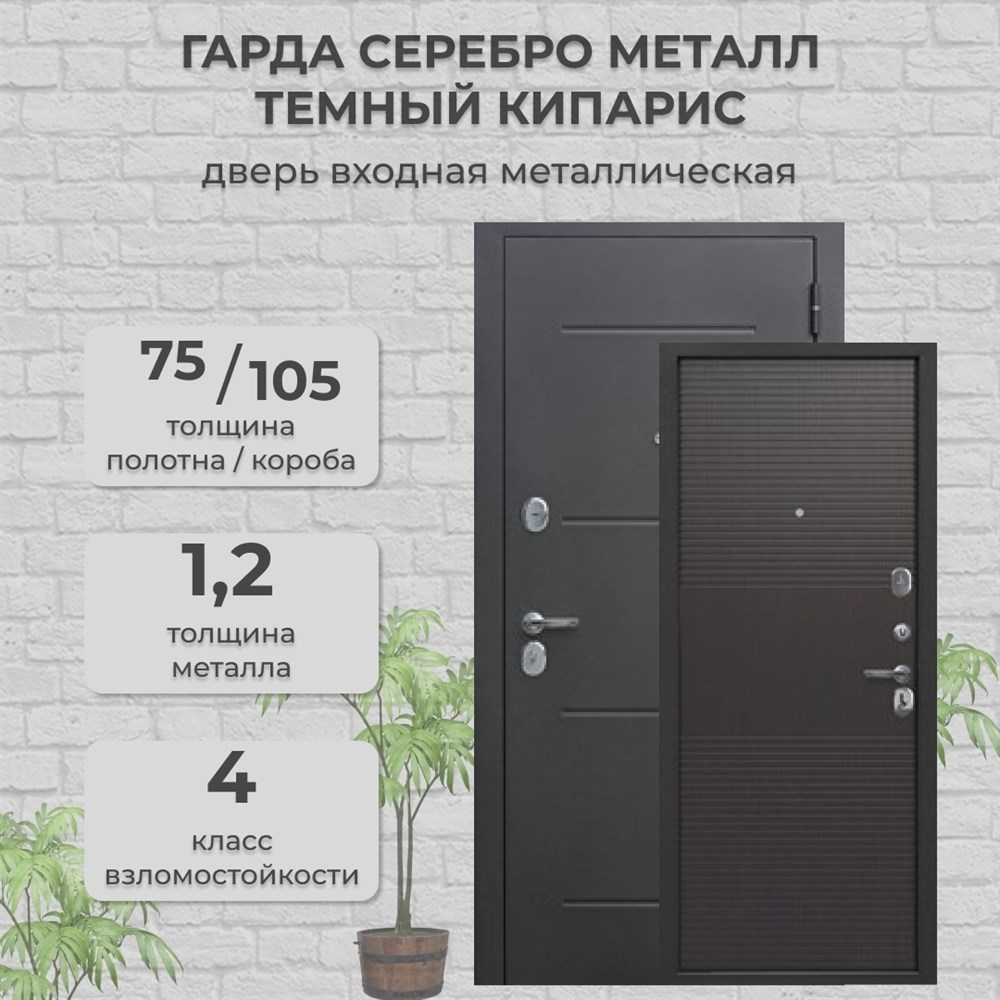 Дверь входная Гарда Серебро Металл/Темный кипарис Ferroni - это металлическая дверь с внешним покрытием из атмосферостойкого порошково-полимерного материала "Серебро" толщиной 1,2 мм и внутренней панелью из фрезерованной МДФ-панель 8 мм в цвете Темный Кипарис. Толщина дверного полотна и короба 75 мм и 105 мм соответственно. Наполнение из пенополистирола, с 2-мя контурами уплотнителя из вспененной резины. Замки КАРАТ, IV (наивысший) класс взломостойкости с цилиндровым и сувальдным дополнительным защитным механизмом от высверливания, с 2-мя пластинами из высоколегированной стали. Диаметр ригелей 16 мм, имеет независимую ночную задвижку, 2 наружные петли с открыванием на 180 градусов, и 3 штыря для противосъёма. Дверь доступна в размерах 860х2050 мм и 960х2050