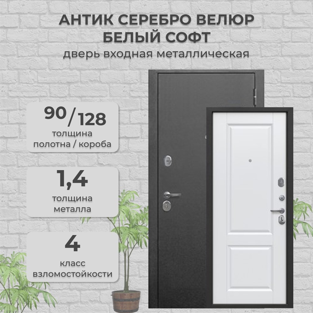 Дверь входная Антик Серебро Велюр белый софт Ferroni - это металлическая дверь с внешним покрытием из из атмосферостойкого порошково-полимерного материала "Антик Серебро" и внутренней панелью из фрезерованной МДФ-панель 10 мм в цвете Велюр Белый Софт. Толщина дверного полотна и короба 90 мм и 128 мм соответственно. Наполнение из пенополистирола, с 3-мя контурами уплотнителя из вспененной резины. Замки КАРАТ с IV классом взломостойкости, с цилиндровым и сувальдным дополнительным защитным механизмом от высверливания, с 2-мя пластинами из высоколегированной стали с обеих сторон замка. Диаметр ригелей 16 мм, имеет независимую ночную задвижку, 3 наружные петли с открыванием на 180 градусов, и 3 штыря для противосъёма. Дверь доступна в размерах 860х2050 мм и 960х2050