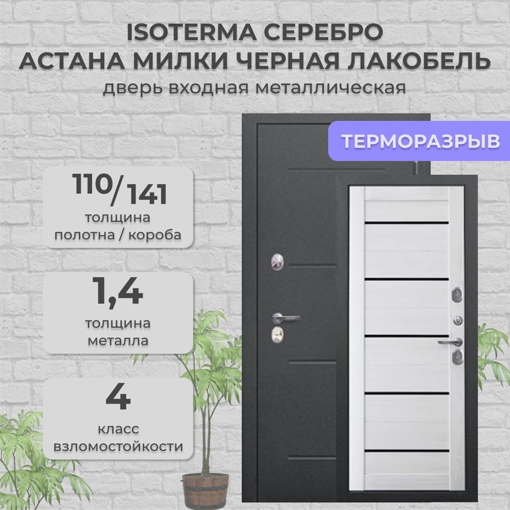 Дверь входная ISOTERMA Серебро Астана Милки черная лакобель (960 мм, Левая)