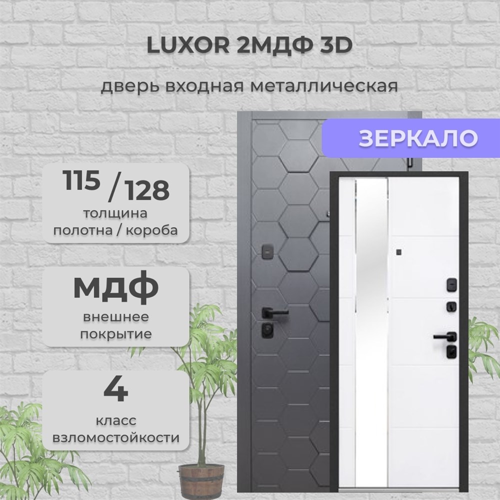 Дверь входная Luxor 2МДФ 3D - это люксовая, премиальная металлическая дверь с внешним покрытием из фрезерованной МДФ-панели 12 мм в цвете "Сатин Графит", и внутренней панелью из фрезерованной МДФ-панели 16 мм в цвете "Велюр Белый Софт" со встроенным зеркало с защитной плёнкой от осколков. Толщина дверного полотна и короба 115 мм и 128 мм соответственно. Наполнение из пенополистерола, с 2-мя контурами уплотнителя из вспененной резины и с 1-м магнитным контуром на коробе. Замки KALE с IV классом взломостойкости, с цилиндровым и сувальдным дополнительным защитным механизмом от высверливания, с 2-мя пластинами из высоколегированной стали с обеих сторон замка и с броненакладкой основного замка. Диаметр ригелей 16 мм, имеет независимую ночную задвижку, 3 наружные петли с открыванием на 180 градусов, и 3 штыря для противосъёма. Дверь доступна в размерах 860х2050 мм и 960х2050 с правым либо левым открыванием.