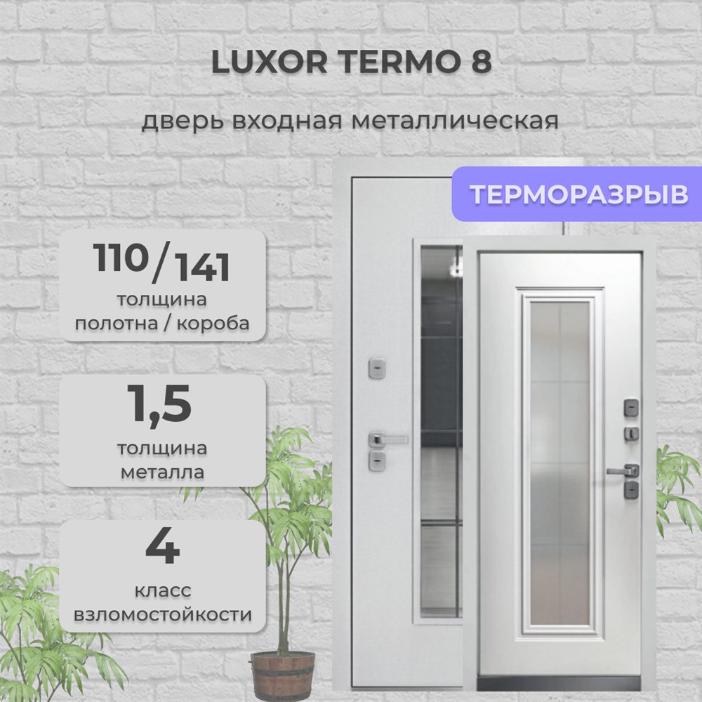 Дверь входная Luxor Termo 8 Белая Шагрень/Эмалит Белый - это люксовая, премиальная металлическая дверь с терморазрывом и стеклопакетом с внешним покрытием из атмосферостойкого порошково-полимерного материала "Белая Шагрень" толщиной 1,5 мм и внутренней панелью из фрезерованной МДФ-панели 16 мм в цвете Эмалит Белый с трехкамерным тонированным стеклопакетом толщиной 83 мм.. Дверь с терморазрывом 24 мм из двухкамерного спейлера из ПВХ разработана специально для установки в частном доме или коттедже. Толщина дверного полотна и короба 110 мм и 141 мм соответственно. Наполнение из PIR-плиты, с 3-мя контурами уплотнителя из вспененной резины. Сувальные замки KALE с IV классом взломостойкости, с дополнительным защитным механизмом от высверливания, с 2-мя пластинами из высоколегированной стали с обеих сторон замка и с броненакладкой основного замка. Диаметр ригелей 16 мм, имеет независимую ночную задвижку, 3 наружные петли с открыванием на 180 градусов, и 3 штыря для противосъёма. Дверь доступна в размерах 860х2050 мм и 960х2050 с правым либо левым открыванием.