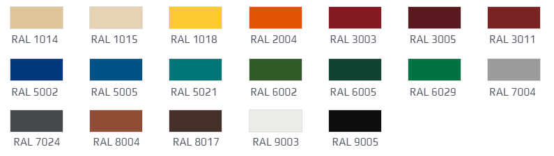 RAL1014, 1015, 1018, 2004, 3003, 3005, 3011, 5002, 5005, 5021, 6002, 6005, 6029, 7004, 7024, 8004, 8017, 9003, 9005