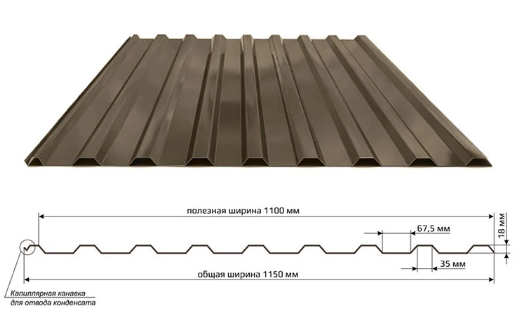 Профнастил МП20 — это стальной гофрированный прокат с канавкой для отвода капиллярной влаги на месте стыка. Гофры профилированного листа МП20 имеют трапециевидную форму. Их высота: 18 мм.